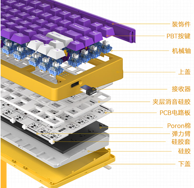 面达尔优A81键盘采用PBT材质双色键帽加弹力臂gasket结构,体现出极致的手感和反馈。轴体采用类似于茶轴的紫金轴Pro,可以全键轴体热插拔,按键力度适中,手感软弹细腻,压下去的时候是很清晰的感觉,没有普通薄膜键盘那种软绵绵的感觉,非常舒适,反馈也非常迅速。PBT材质键帽经久耐磨还不打油,非常适合长时间游戏玩家或长时间码字用户使用。