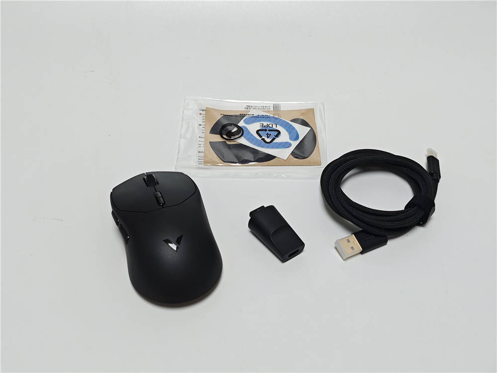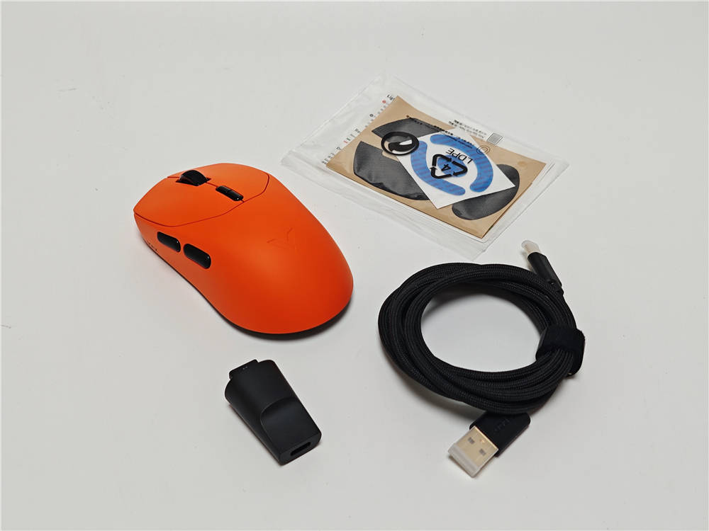 产品包装沿用银色镭射风格,背面提供了产品的参数、介绍等内容,配件有NANO 8K接收器、USB转接器,支持8K回报率的USB-C带屏蔽高速数据线,替换脚贴、防滑贴以及说明书。