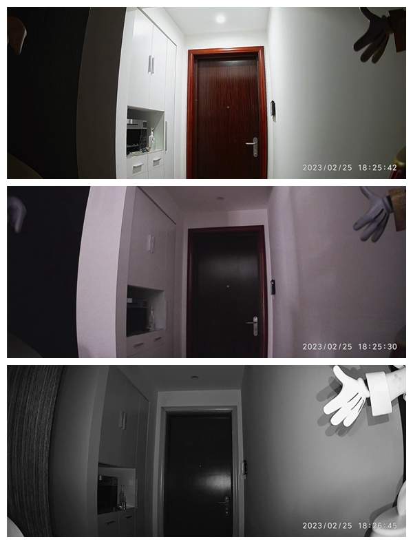 ▲上图就是入户门的角度,分别为开灯和完全关灯一点亮都没有的状态时,摄像头输出的画面,夜视效果是真牛批,啥人来了都能给你看的非常清楚,就这么简单粗暴。最主要的是夜视功能完全根据环境感知的,也就是说关灯后,摄像头会自动进入夜视状态,完全无需人为操作。