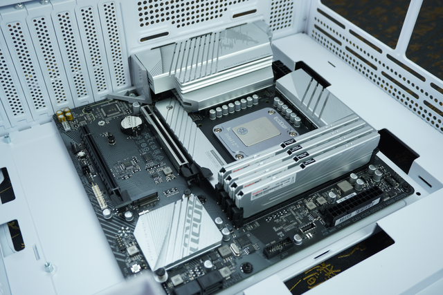 四条内存插满的满足感,不仅满足了强迫症的小心思,甚至还与主板的散热片矩阵组合成金属堡垒,科技感与安全感竟然也有了~