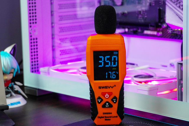 拿出噪音计测一下音量,电脑稳定运行时的声音表现35dB左右,这个表现怎么形容呢?我试着咳嗽清嗓子的音量60dB左右,这样对比就感受到静音效果了。