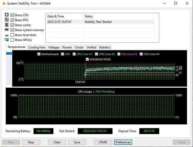 AIDA64做一个稳定性测试,火力全开的情况下拷机15分钟,冰魔方360交出CPU最高温度75℃的答卷。
