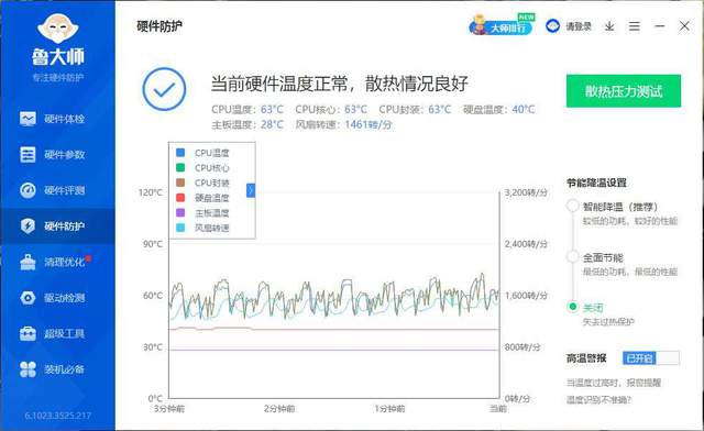 这次小雕B760M主板不支持CPU超频,本次13600K的“K”无法发挥最大效能,默频状态下跑一遍鲁大师的散热能力测试,可以看到最高温度63℃、转速1400-1500RPM,距风扇2500RPM的预设顶额表现尚有不小差距,也就是说散热仍有余力。