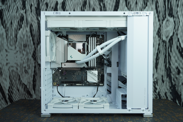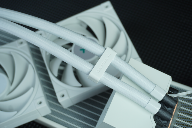 水管外覆高密度尼龙包网,整体白色非常好看。搭配专属的水管理线夹,装机走线更方便固定方向。