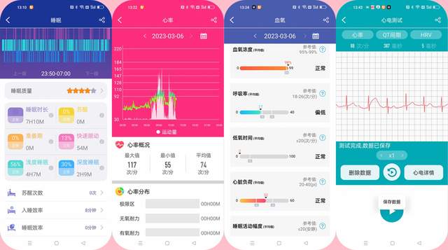 全天实时心率、血压、血糖趋势检测,时刻关注心率、血压、血糖的变化曲线,并自动上传APP生成图表,并分析出结果。另还有血氧、体温、女性生理期等等检测记录功能。
