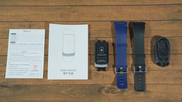 ▲拿掉包装后,就是这款手环的配件清单了,包括dido F50S Pro智能手环、蓝色/黑色表带、磁吸充电器、说明书、保卡。