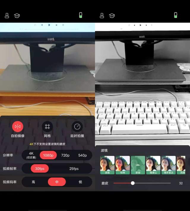 APP里提供了不同的设置选项,后置还支持4K视频拍摄。它还内置了5个常用的滤镜和美颜功能,我们就可以根据实际需要来选择适合自己风格的滤镜,拍摄视频帧率和码率也能根据使用者的需求进行调整,让视频拍摄更加出色。