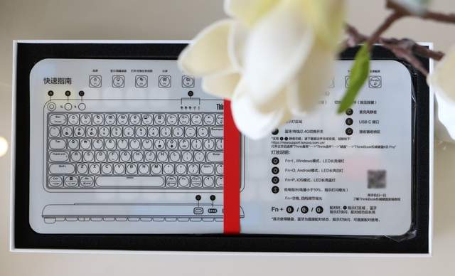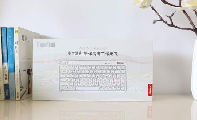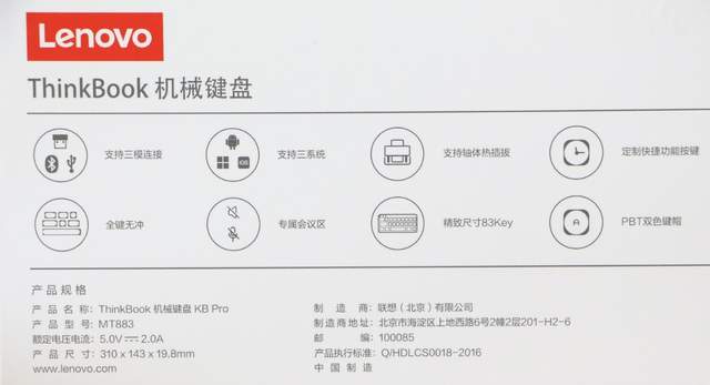 ThinkBook机械键盘KB Pro外包装风格是时下潮流的极简小清新白色设计,外包装还印刷了键盘外观图案以及支持三模连接、三系统、热插拔等几个重要特性。