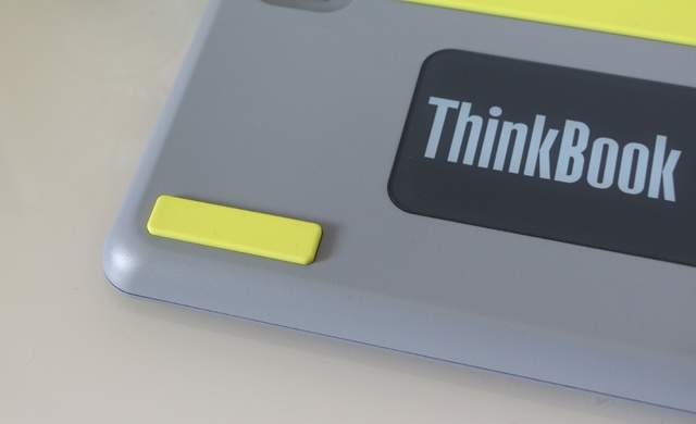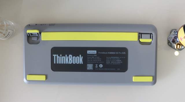 ThinkBook在背面一样用心进行设计,采用黄灰撞色设计,并加入大面积的防滑,使用的时候,键盘可以稳稳地停留在桌面上。