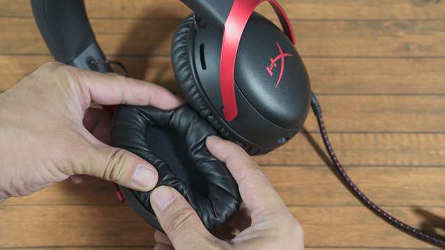 ▲飓风三代的头梁采用超细皮革包裹,表面握感非常饱满,触感细腻,表面进行了HyperX的烫印大LOGO,非常有辨识度。