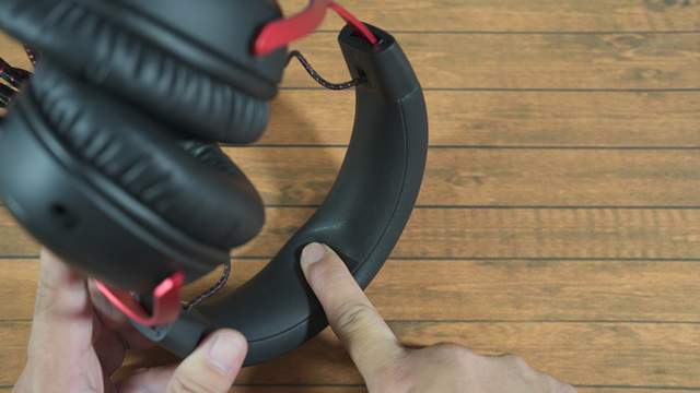 ▲这款电竞游戏耳机的耳罩单元顶端,采用走外线连接方式,好处呢就是左右微摆动及头梁骨架伸缩灵活无束缚,外线采用黑红配色尼龙包裹,与耳机连接线相一致,整体性非常强。