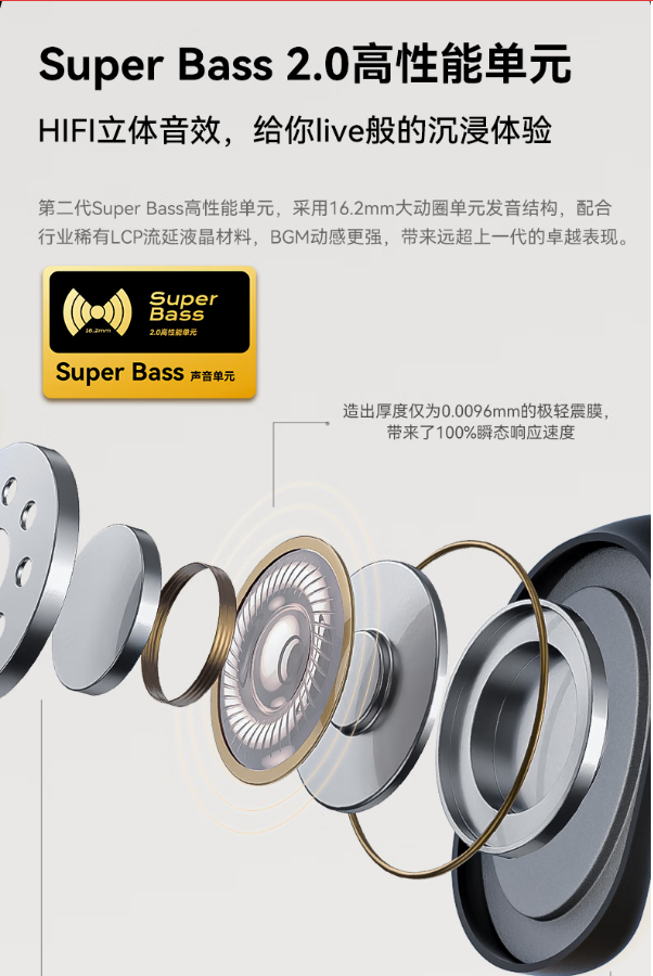 第二代Super Bass高品质的扬声器配上16.2mm大动圈单元,配合行业如数珍宝的LCP流延液晶材料,使得BGM动感更强,适合我常听的流行音乐,南卡OE pro并不是一味的大声,并不混乱嘈杂,人声清晰,透彻,音乐高频不刺耳,中频平缓稳定,在低频方面也清晰有力,让聆听体验更加饱满丰富,这次南卡的音效师调教的太棒了。
