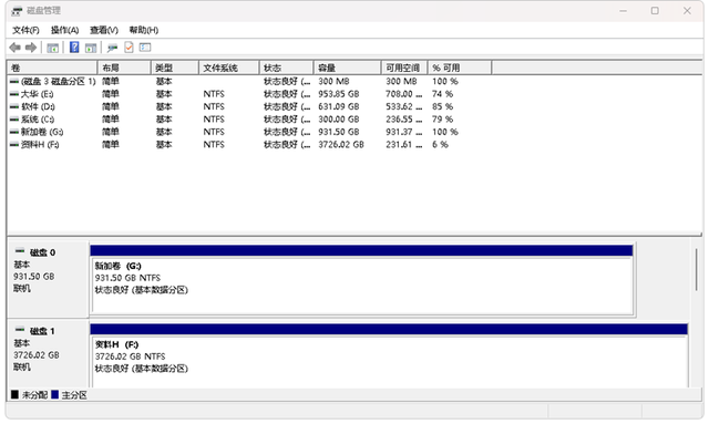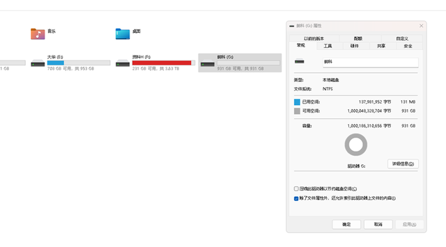 ▲插入新存储设备后必须进行磁盘管理,系统自动格式化后,新起个盘符G,朗科超光N550S 2.5英寸固态硬盘识别出的容量为为931GB,这也是正常的,属于系统二进制算法,跟U盘一样,都会比出厂容量标值少一点。