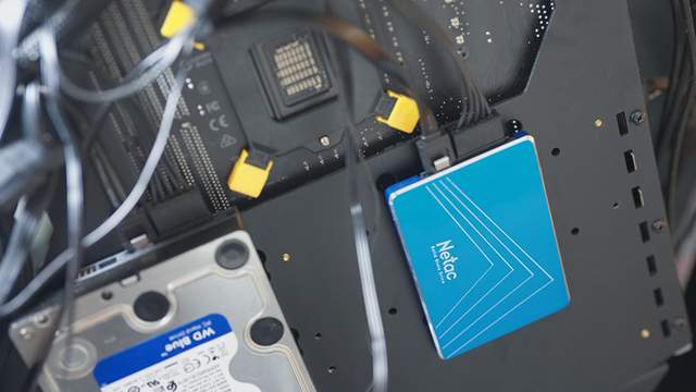 ▲直接上四颗螺丝挂载到机箱背面,与机械盘一起作伴,这个蓝色确实好看,这种固态硬盘的好处就是比3.5寸机械盘更轻更薄,既可以台式机使用,笔记本支持SATA接口的也能使用。