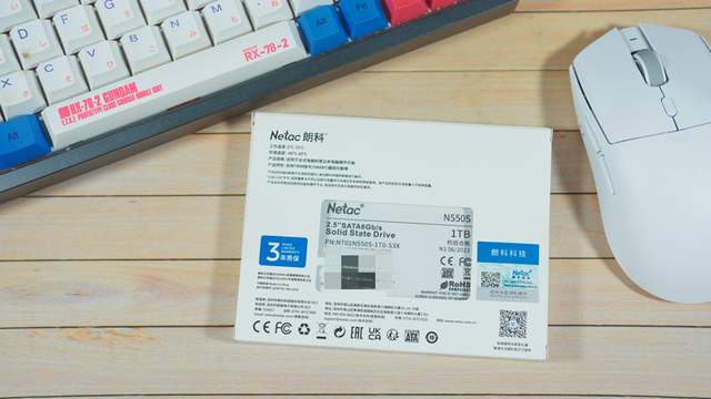 ▲先从包装开始,白蓝配色纸盒材质,常用的PC硬件包装风格,封面标注了Netac朗科品牌名,3.0 NAND固态硬盘,2.5英寸SATA 3.0 6Gb/s的产品及性能标注。背部标注了这款固态硬盘的数据性能及厂家信息等相关认证。