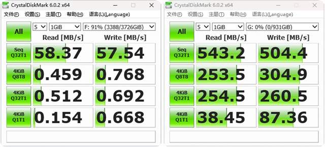 ▲CrystalDiskMark算是家喻户晓的硬盘速率监测工具了,监测数据块设定1GiB,朗科超光N550S 2.5英寸固态硬盘的连续读取543MB/s、写入速度504MB/s,左侧为机械盘的速率,与官方旗舰店的标注的读写速率基本吻合。