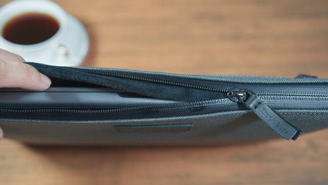▲重点来了,这款包包也是我目前接触过的内胆包、笔记本收纳包里面算防护最强的,里面内衬的材质采用柔软的人造长绒毛设计,并且还有复合弹性材料进行缓冲,装入笔记本后顶端还有一个绒毛材质的防护挡条,直接规避了拉链头的金属来回开合对笔记本造成摩擦,加防水拉链涂层。一个字,真稳。