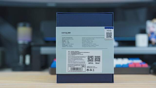 ▲包装方面采用藏蓝和浅蓝配色的纸盒材质,封面涂装非常有感觉,一个骨传导耳机在水中的景象,也证明了这款耳机是具有防水能力的,涂装了sanag塞那B60S PRO MAX这款耳机的品牌及型号。背部就是这款耳机的性能参数、核心技术及厂商信息。