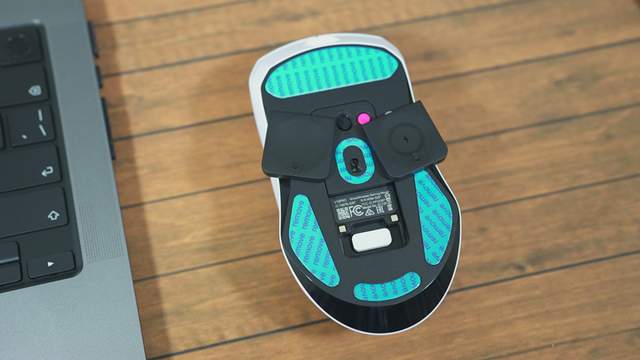 ▲底部就是常规的特氟龙脚垫,脚贴我还是比较喜欢上下共两片大尺寸的,操作心理有底,个人喜好问题。中心就是光学传感器,电源开关,下方的圆盘就是2.4G接收器收纳槽,圆盘和接收器均为磁吸设计,防丢效果做的不错。随即还搭配了一直无限磁吸的充电模块圆盘,直接放充电板即可充电。