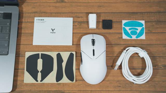 ▲开箱,配件展,雷柏给我的印象就是配件是真的非常丰富全面:雷柏VT9 PRO双模无线游戏鼠标、1.8米伞绳充电线、USB转换器、2.4G接收器、按键贴、侧裙贴、脚垫贴、无线充电模块、说明书保卡。