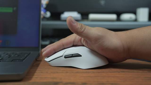 ▲实际上手效果,手掌尾部到手指,可完全覆盖鼠标整体,刚刚好。握持方面趴握和抓握是我个人的操作习惯,超轻量化的设计,对激烈的游戏体验是非常关键,太重的鼠标不适合抓握。这款VT9 PRO是真的轻,无需太大发力即可抓起。