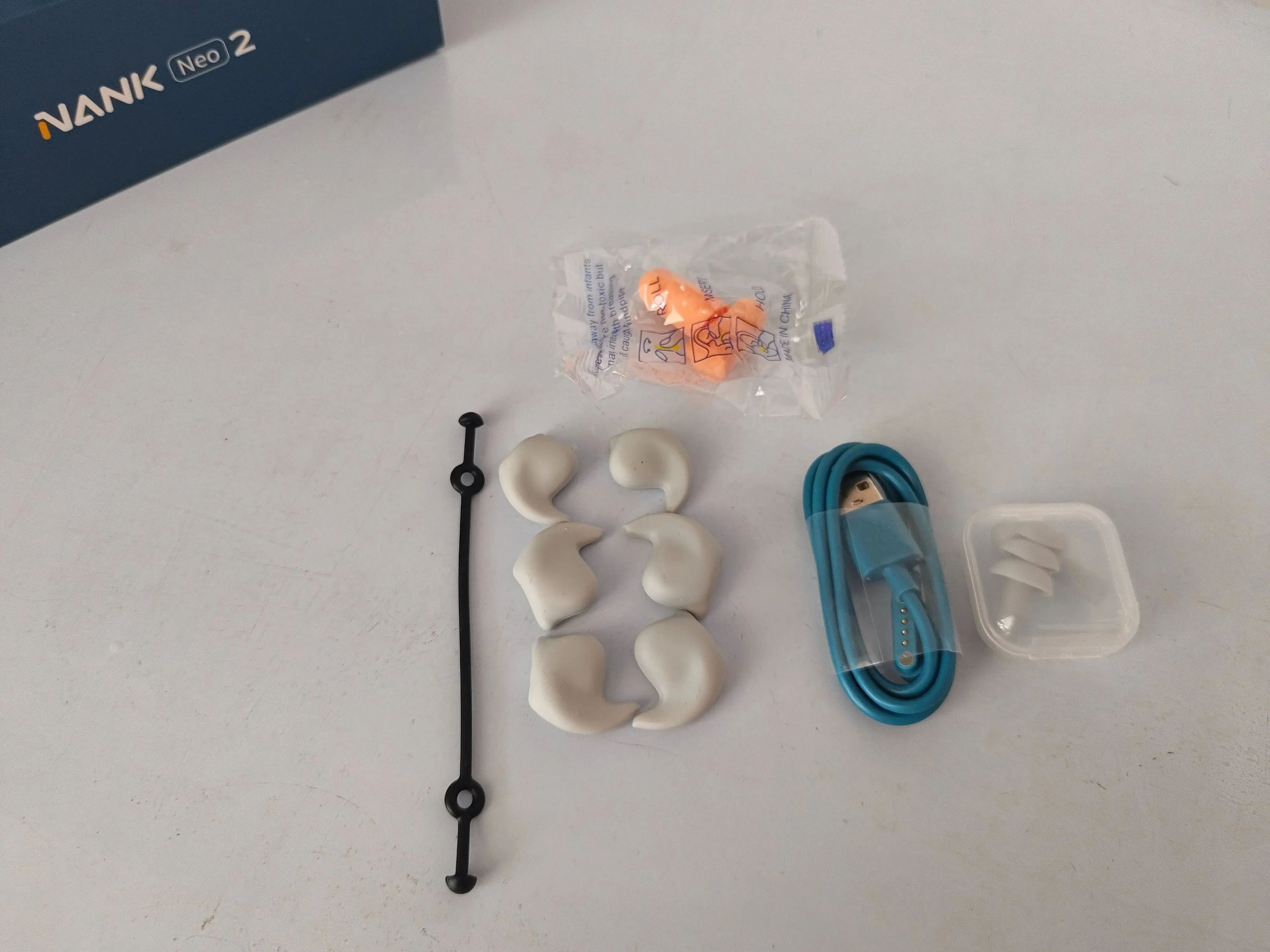 配件方面真心齐全,耳音质增强器三对、耳塞一副、产品说明书、一根松紧带、一对游泳耳塞、一根充电线,划重点,这根充电线也是数据线。