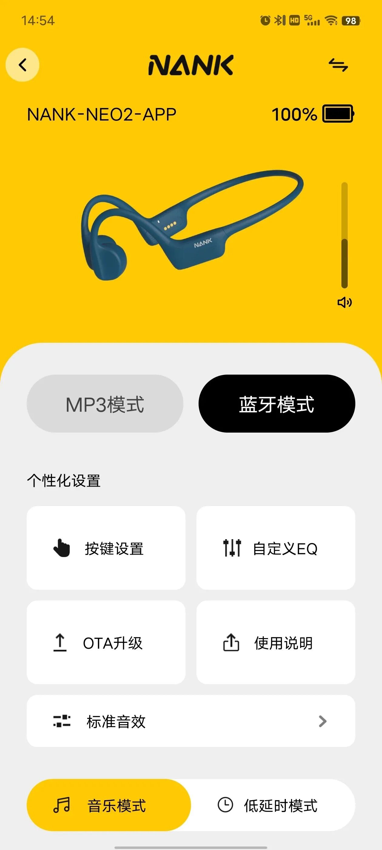 打开南卡APP可以看到耳机已经与软件连通,可以在App上进行mp3或者蓝牙模式的切换,十分便利,在上方能看到当前设备剩余电量与音量大小,在底部可以选择两种模式,音乐与低延迟(游戏模式),个性化设置中有五中选项,值得一提的是EQ模式,可玩度还是极高的。