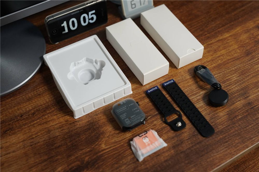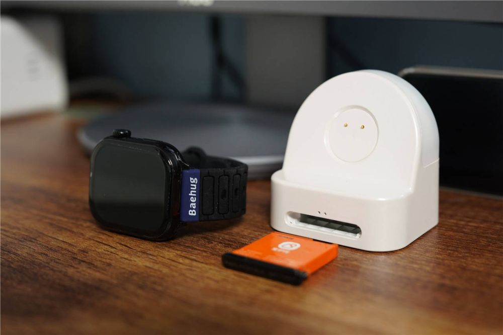从包装盒中将宝护光X8青少年电话手表主机和配件依次拿出,可以看到套着保护材料的智能手表主机、可更换的便携电池、食品级硅胶材质的表带、USB充电接口的磁吸充电器,配件简单而实用,可更换的表带后期还可以自己去个性化配置。