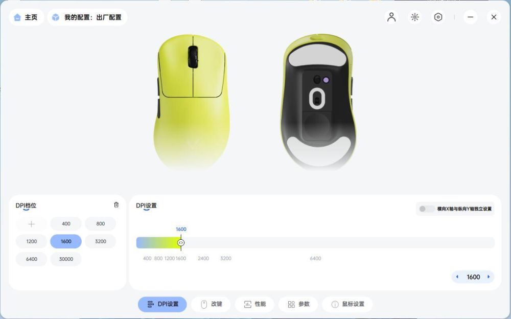 A HUB支持DPI设置,改键,性能,参数以及鼠标设置。在设置界面可以调节七档预设当中每一档的预设DPI值,还可以开启X轴和Y轴独立设置功能,设定更加自由。