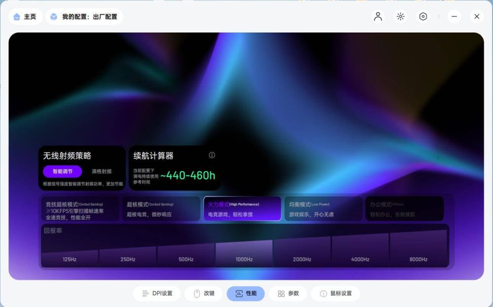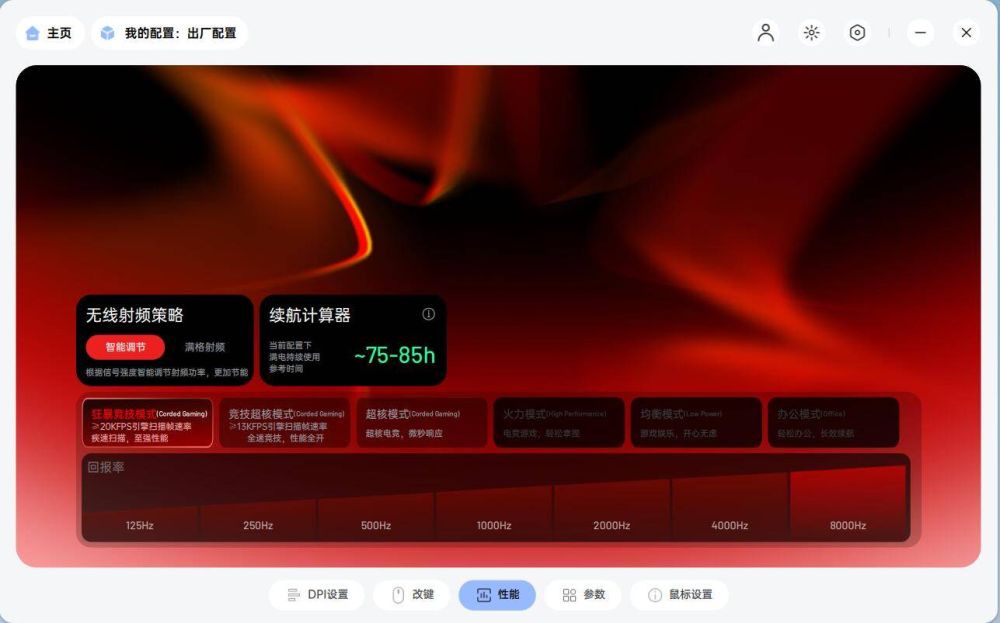 在A HUB的性能页面中可以调整性能模式(狂暴竞技模式、竞技超核模式、超核模式、火力模式、均衡模式、办公模式)和回报率,提供多种组合,合适从办公到极限电竞游戏场景,在不同场景下A HUB还会自动计算鼠标电池续航,方便玩家根据自己的需要进行调整设置。
