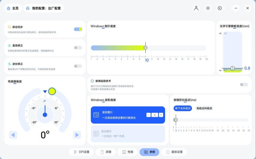 在A HUB的鼠标参数设置页面,可以对传感器角度、指针速度、光学引擎静默高度、滚轮速度、按键防抖延迟等参数调整,根据自己使用习惯进行随意调节,让鼠标更加顺手。
