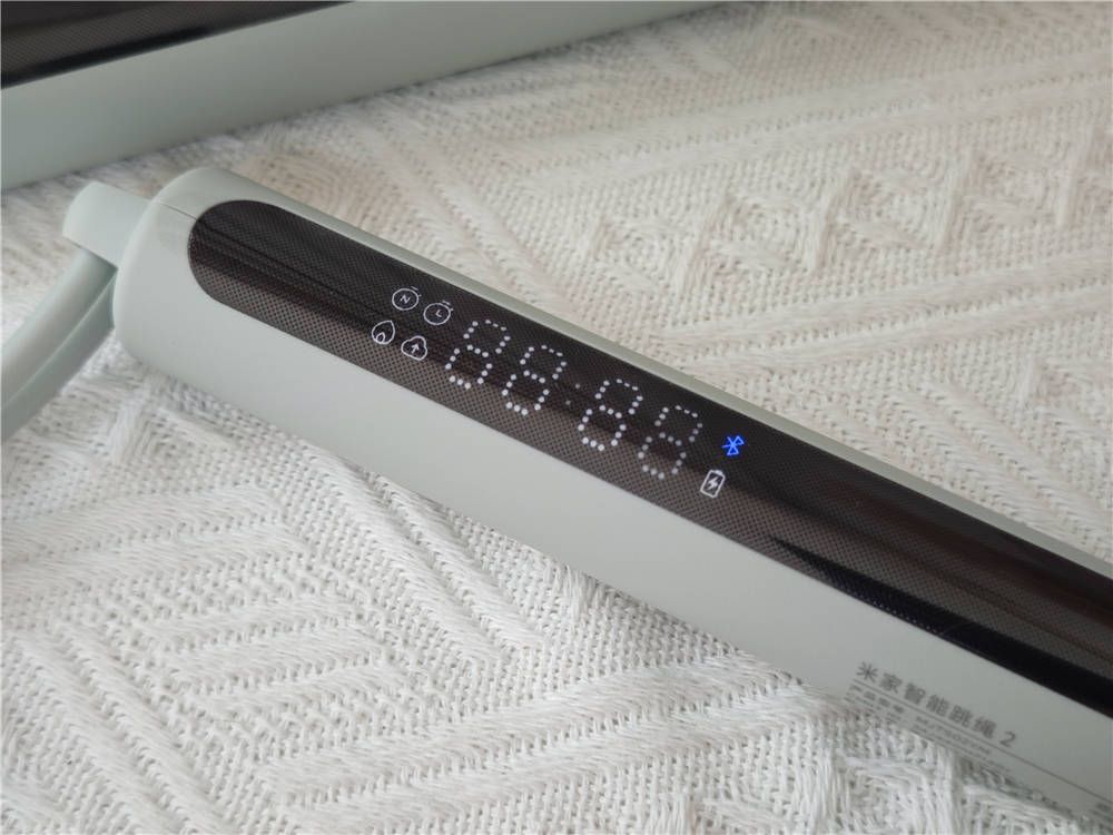 椭圆形点阵数显屏幕,搭配深色跑道设计,让数字显示区域更突出,屏幕可以显示:跳绳个数、训练时长、卡路里消耗、硬件升级、蓝牙状态和电量情况。