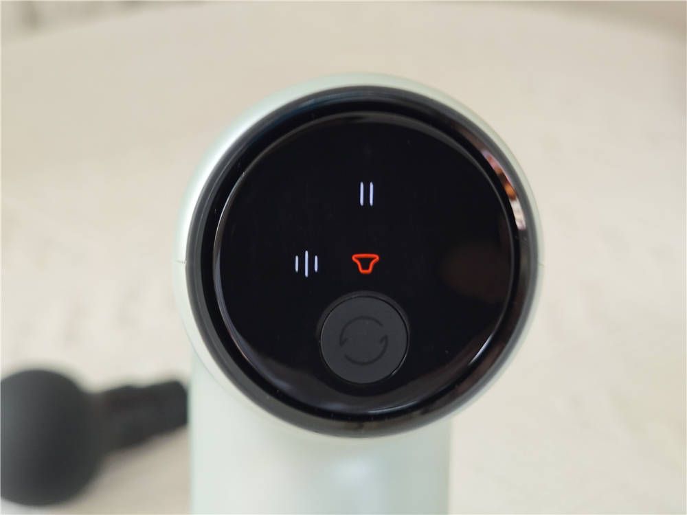 米家热敷筋膜枪H3迷你版手柄背面采用一体化LED指控面板,LED显示面板有:充电指示灯、力度挡位/电量指示灯,热敷挡位指示灯、定频模式指示灯、热敷头插入指示灯、变频模式指示灯,外围一圈为力度指示灯环,用户可以根据灯环状态,判断力度。下方底部有一颗功能键,长按功能键2秒开/关机键开机,短按切换挡位,一键操作更快捷。