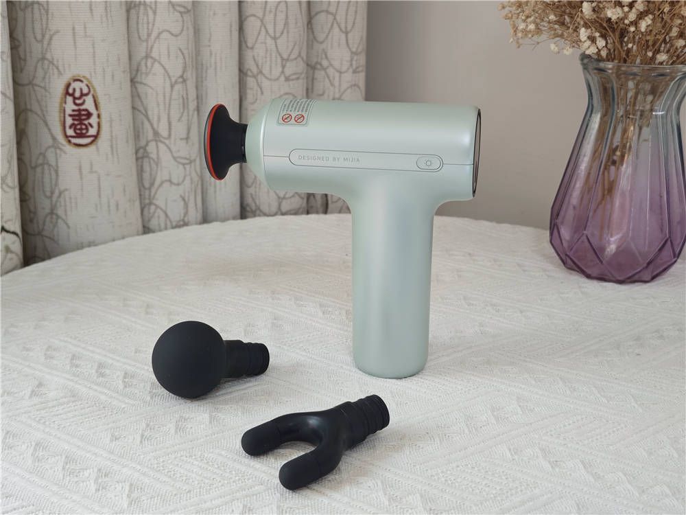 日常工作久坐或者运动完肌肉酸痛,使用筋膜枪,能缓解肌肉紧张,米家运动健康套装中的米家热敷筋膜枪H3迷你版,机身巧小,重量仅440g,适合外出携带,机身一体化结构设计,外壳做磨砂质感处理,握感细腻舒适。