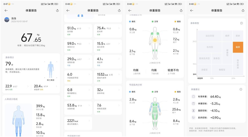 用户可以通过APP一键获取包括体脂率、肌肉量、骨量在内的40项详细身体数据。系统会自动生成个性化的人体成分分析报告,并结合用户的身体状况提供专业的健康管理建议。
