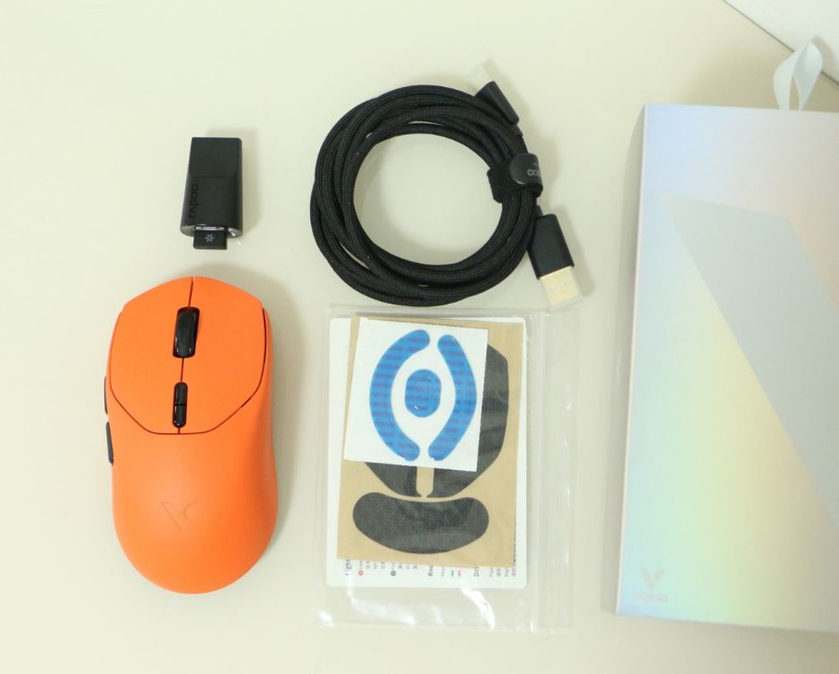 同时,包装里面依然标配了快速上手指南、质保卡、充电数据线、8K接收器,防滑贴、备用脚贴、USB转换器等等众多配件。