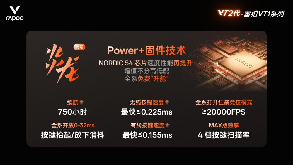 最近雷柏为其推出的全球首发Nordic 54系列芯片的VT1二代无线电竞鼠标推出了Power+(代号:炎龙)的固件技术,不分高低配,标准版、MAX版均可通过OTA增值。VT1MAX开放了独享4档按键扫描率,1000Hz/2000Hz/4000Hz/8000Hz,≤0.225ms无线最快按键速度,≤0.155ms有线最快按键速度。VT1还加入了本来只有MAX版拥有的狂暴竞技模式,拥有市面上续航最强的超20000FPS全段扫描帧速率,加上高回报率,电竞强跟手感。此外VT1系列还加入了按键抬起、按下消抖延迟开放0-32ms可调。