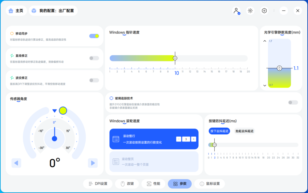 同时,还能对VT1鼠标的实体按键(6个独立按键+3合一的滚轮按键),同时鼠标底部还有一个防误触DIY独立按键(位于鼠标开关右侧),可以对鼠标按键功能进行自定义设置、参数切换。