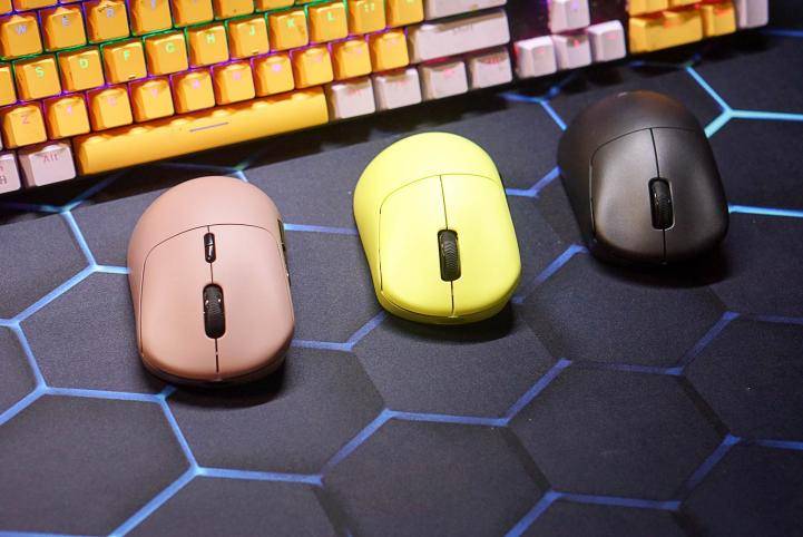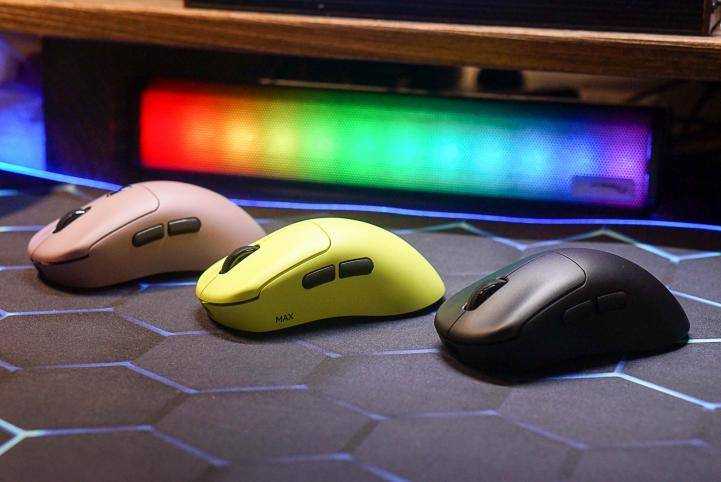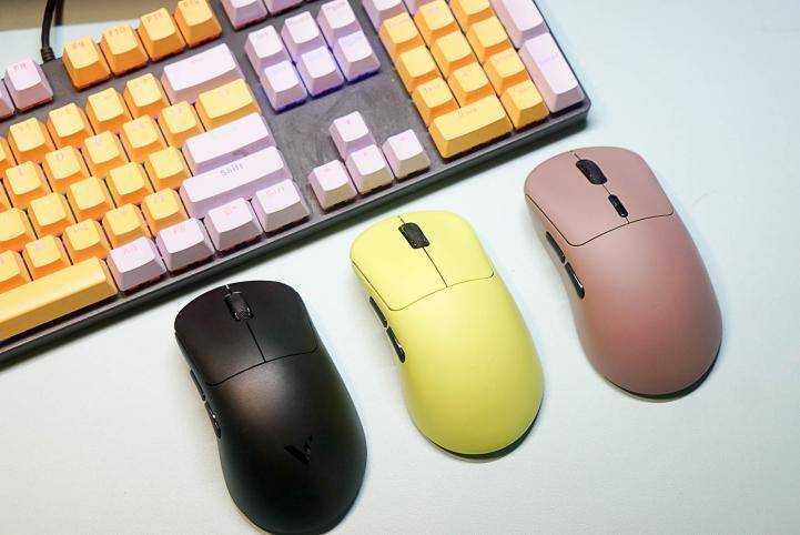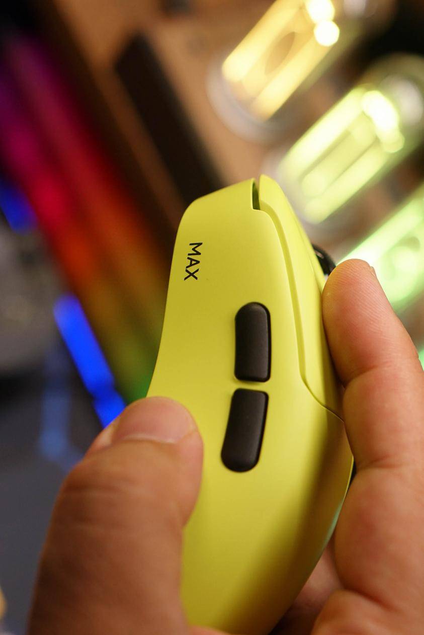 我手上的这几款鼠标分别是黑色的VT3s、炽光黄的VT3s MAX和冰莓粉的VT3,同一系列的鼠标还有胶月白、树莓粉的配色,而VT3s MAX鼠标左侧的还印刷有MAX型号的标识,通过它可以非常清晰地分辨出VT3、VT3s和VT3s MAX的型号。