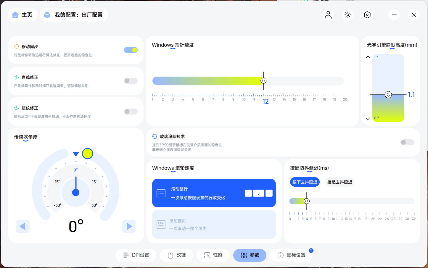 传感器:原相定制395Ultimate 0.7-1.7mm 11档静默高度可调 10-45000DPI