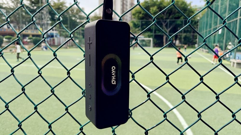 OHAYO 雷登 S11蓝牙音箱,外观方面设计得很时尚好看,方正的造型,正面一整面都是镂空设计,可以看到那颗硕大的赛道扬声器轮廓。整机外壳磨砂处理,在易用、耐磨、防污等方面也很让人安心。雷登S11还很贴心的设计了侧边挂绳,很方便外出携带使用。