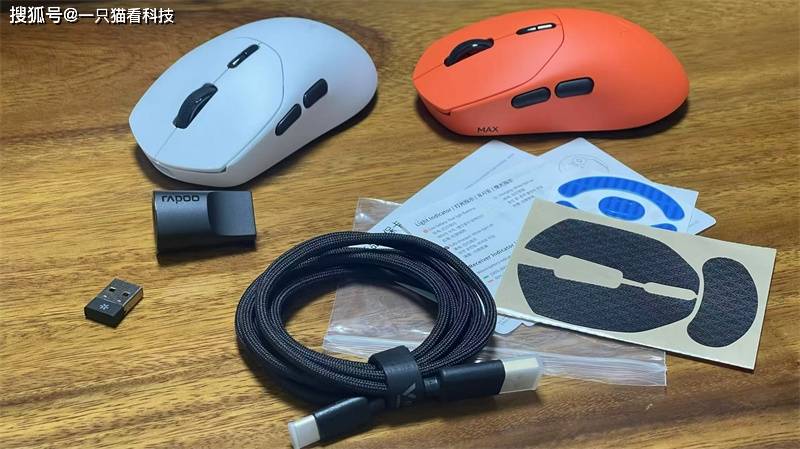 由于VT1和VT1MAX采用相同模具,为了避免日常使用拿错,普通版入手黑白配色,而MAX版则是焰影橙配色。两款产品在配件上也非常一致,赠送有USB-C 伞绳数据线、Nano 无线接收器、USB-A 转接器、专用防滑贴、备用可替换脚贴 、产品说明书/保修卡。