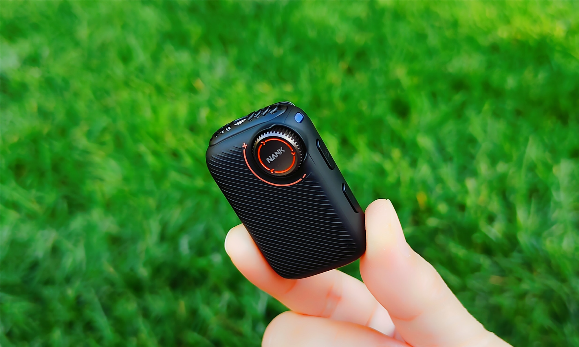 两只无线麦克风精致小巧,迷你外观,尺寸为42*22*20mm(包括背夹),正面右上方是一个圆形的旋钮,上面印有NANK品牌LOGO;麦克风顶端是收音孔,外罩亮银色的防风网和塑料保护罩,内置360度全指向麦克风。