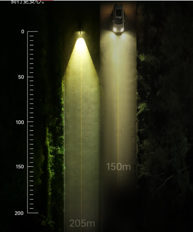 Pro款延续CBL 1600远近双光可调的功能,在下坡、乡间野骑以及速度较快场景下,需要提前对前方路面进行预判,留出足够的制动距离,建议使用远光模式,最大的亮度下最远可照205m,超越了大多数汽车大灯,路面覆盖最宽15米,路面坑洼凸起提前预知,尤其是像转弯和光照不足的路面,提升自身的辨识度,无死角守护夜骑安全。