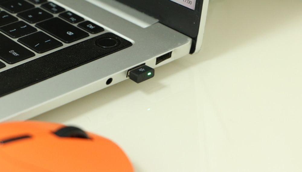 更妙的是,和其他VT系列鼠标一样,雷柏VT1系列自带的nano微型8K接收器自带了电量指示灯,能显示鼠标电量,如果是插在笔记本上,就很方便,看到鼠标的电量变化。