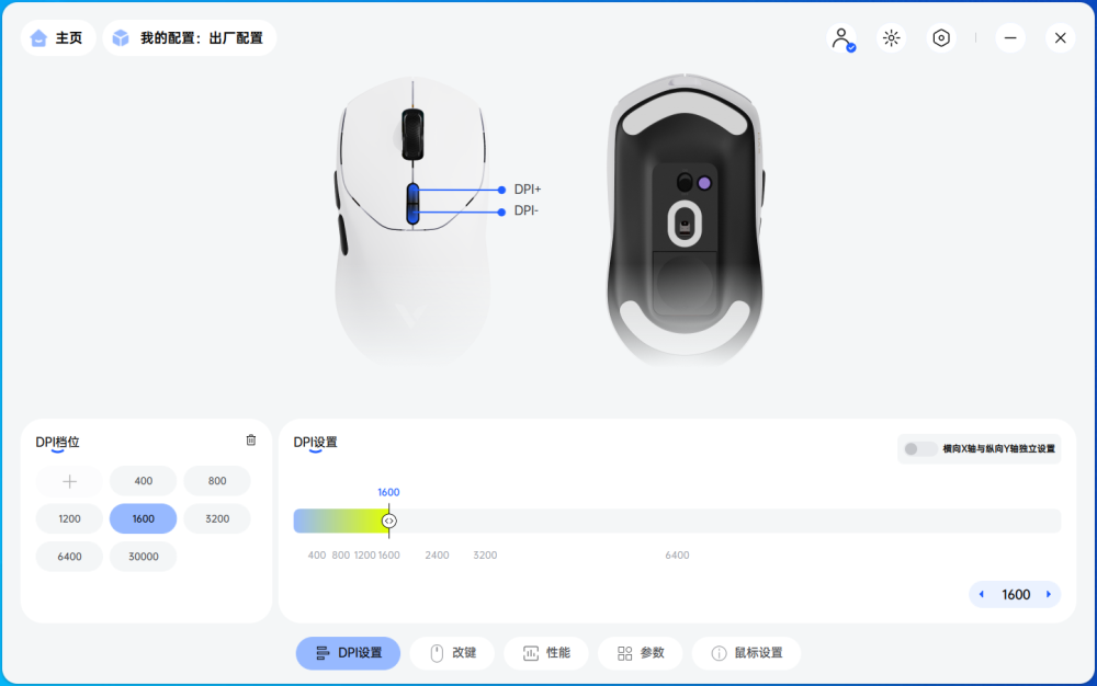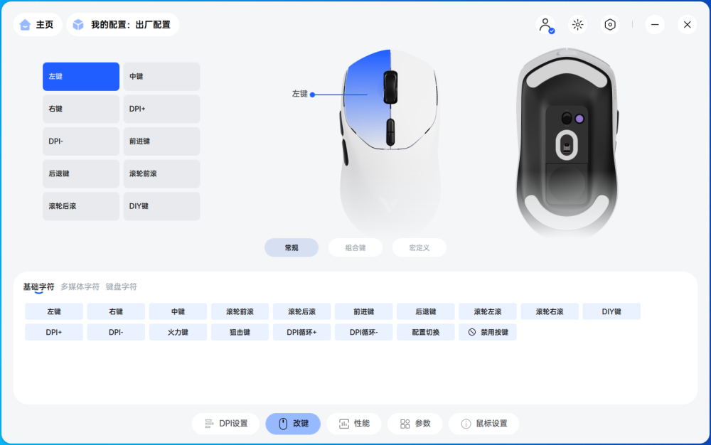 同时,还能对VT1鼠标的实体按键(6个独立按键+3合一的滚轮按键),同时鼠标底部还有一个防误触DIY独立按键(位于鼠标开关右侧),可以对鼠标按键功能进行自定义设置、参数切换。
