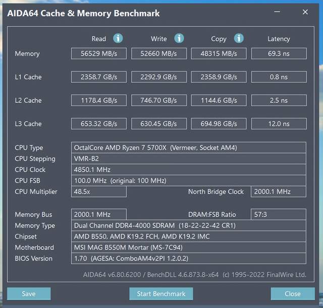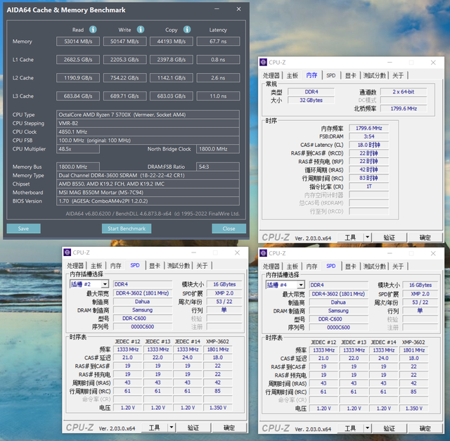 初次使用的朋友,记得在BIOS打开XMP,将频率调整到3600Mhz,保存趴一下就进入系统了,使用AIDA 64跑分测试,读取速度为:53.01GB/s,写入速度为:50.14GB/s,延时为:67.7ns。