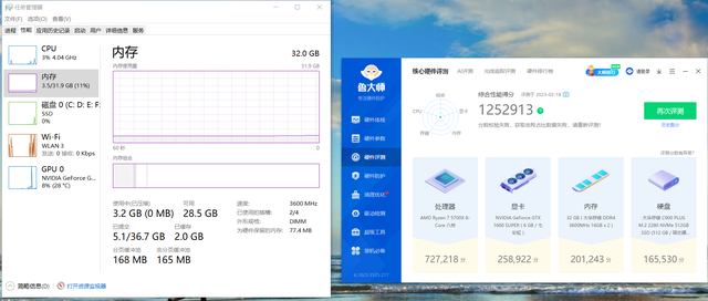 从金手指侧可以看到大华C600内存采用的是单面颗粒设计,背面贴合颗粒的马甲为金属材质,可以更好地导热散热。背面标签备注了内存规格,频率DDR4 3600MHz,时序CL18-22-22-42,套条S/N连号,兼容性表现也更佳。而实际使用我们还可以进行小超一下。