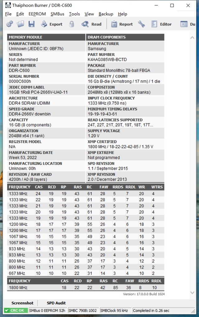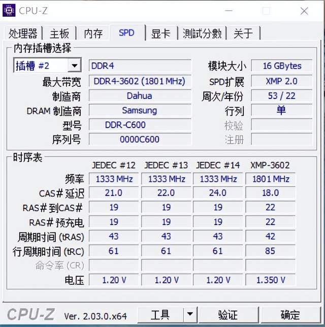 从CPU-Z和台风能看到大华C600内存套条采用的是三星的B-Die内存颗粒,三星的B-Die内存颗粒已经在多款内存中见过了,稳定的性能,不错的超频能力,收到各路玩家的热捧。